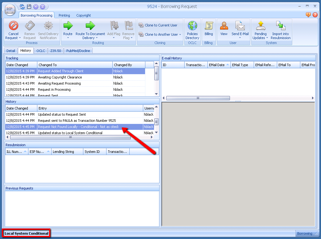 Conditional requests processed with Local Routing are handled manually and responses are not automated. If a request is returned to the borrower with a conditional are updated to Local System Conditional status. The Conditional reason will display in the request History. For the Lender, the Conditional request will be updated to Cancelled by ILL Staff.