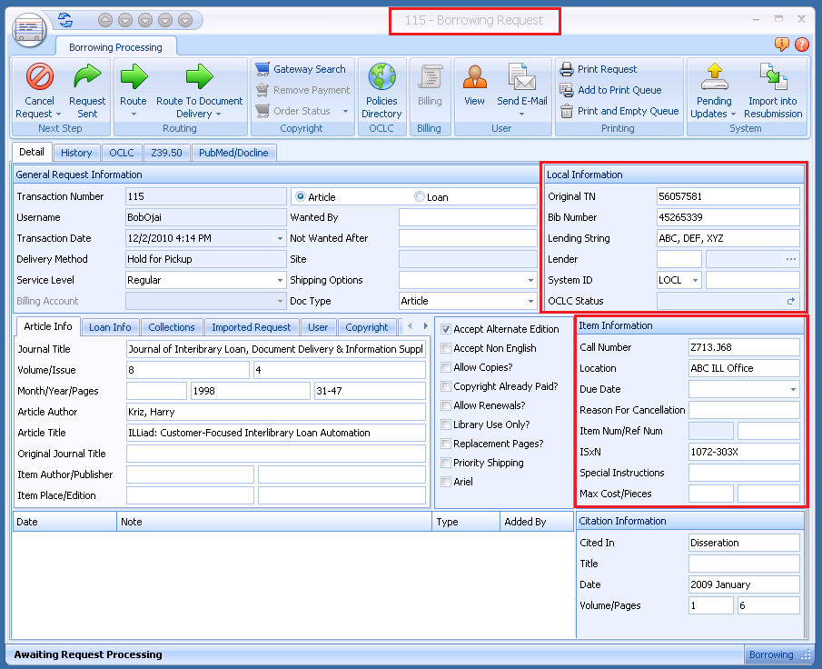 - Click on the Request Sent Borrowing Processing ribbon icon to mark the item as sent.