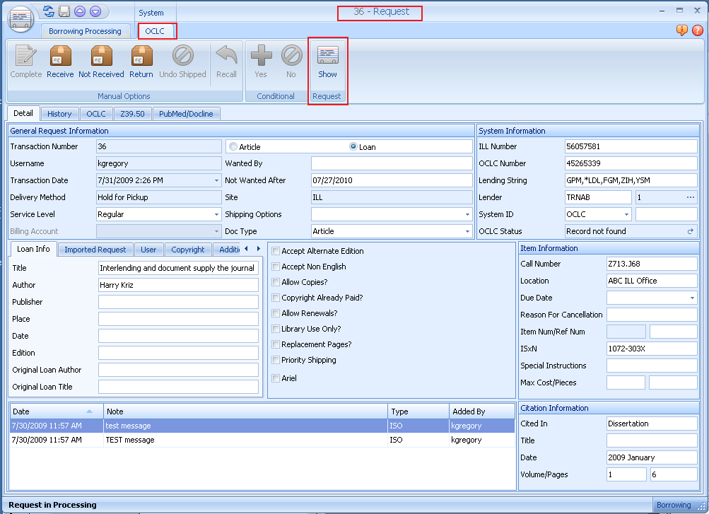 Selecting the Show Request option from the OCLC Ribbon on the Request form will display the OCLC Request form.