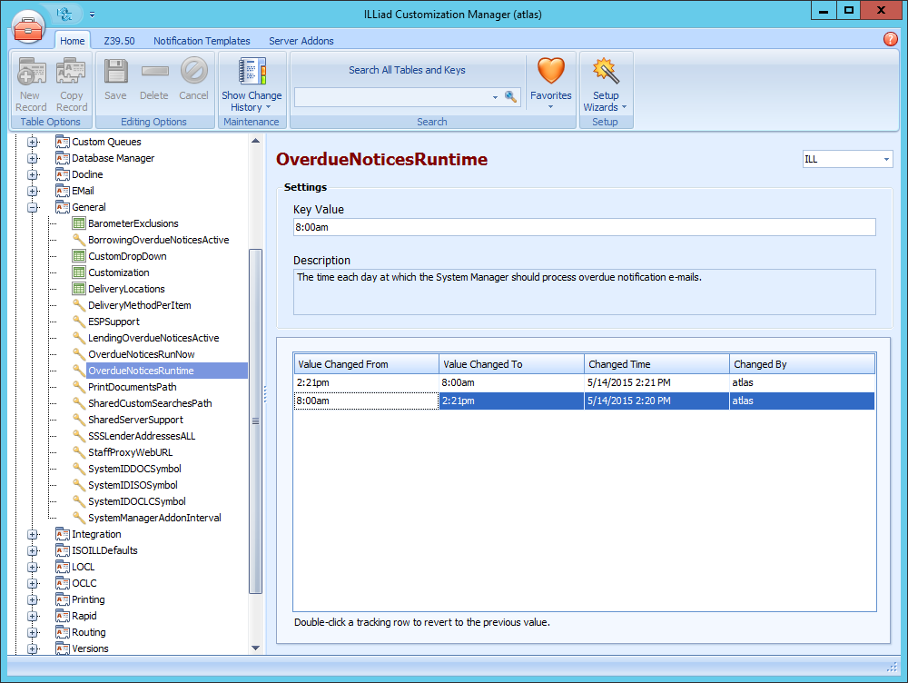 1. In the ILLiad Customization Manager, navigate to System | General | OverdueNoticesRuntime.