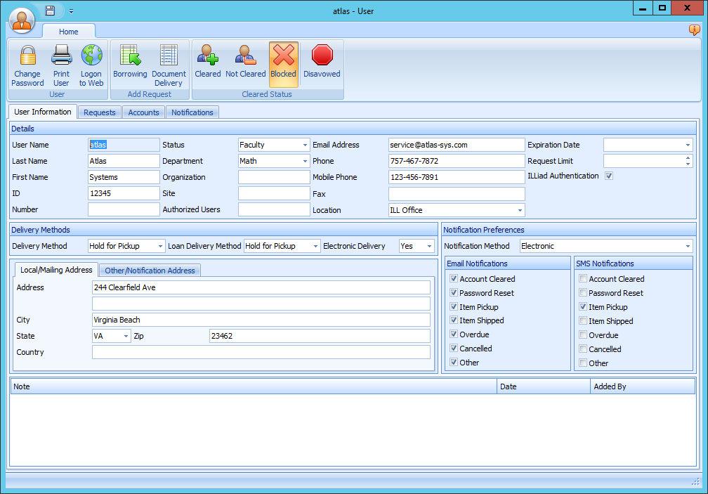 By default, blocking prohibits a user from submitting further requests in the ILLiad web interface. Additionally, in their User record in the ILLiad client, their cleared status will be changed to Blocked.