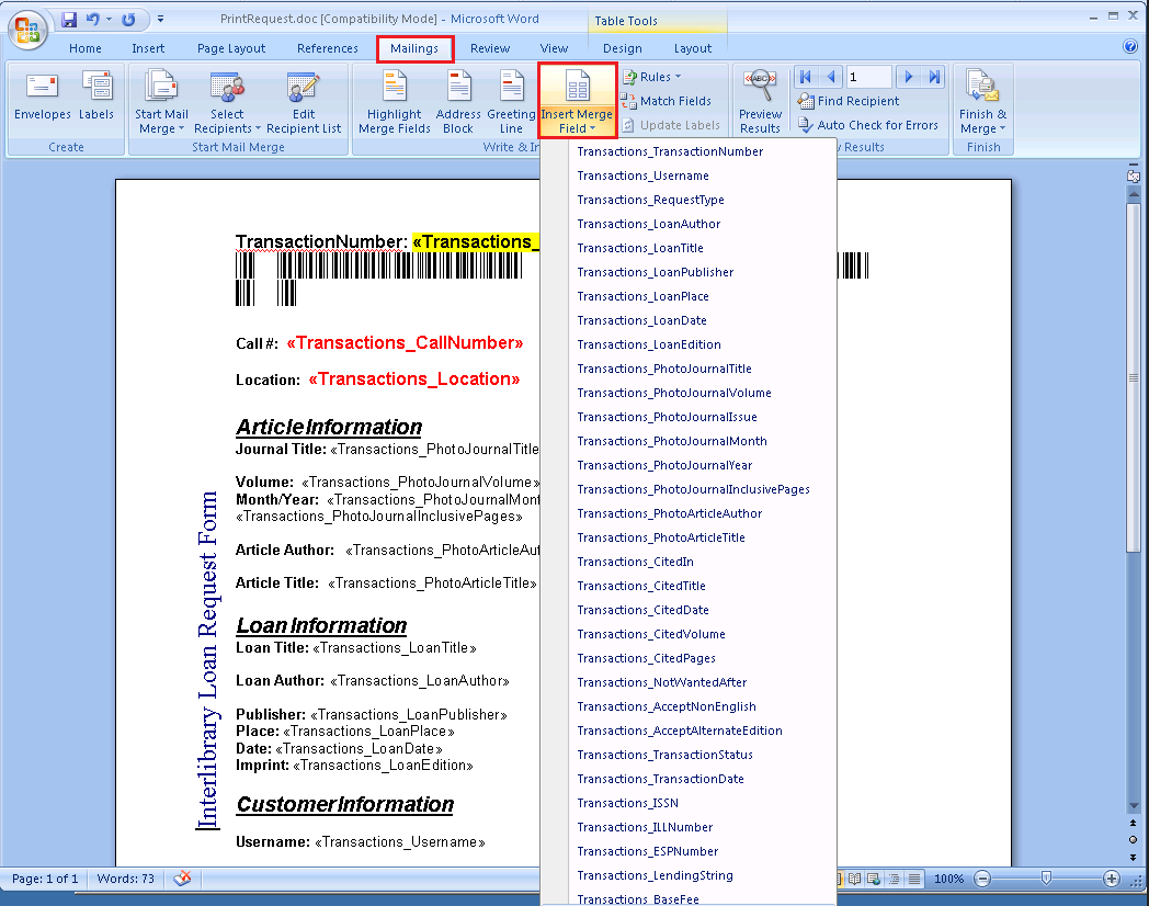 You can add any ILLiad field related to the current record by clicking the Insert Merge Field drop-down box on the Mailings tab of the Word template. Clicking a field name on the list will add the record to the mail merge document and show a merge tag within the template. Editing is easier if the MERGEFIELD coding is not visible. To toggle the codes off and on, use Alt F9.