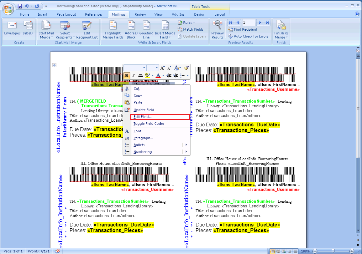 Right-clicking on a merge field and clicking the Edit Field command provides you with many options for formation mergefield information. For example, you can print a patron's last name in all caps by using the Uppercase command.