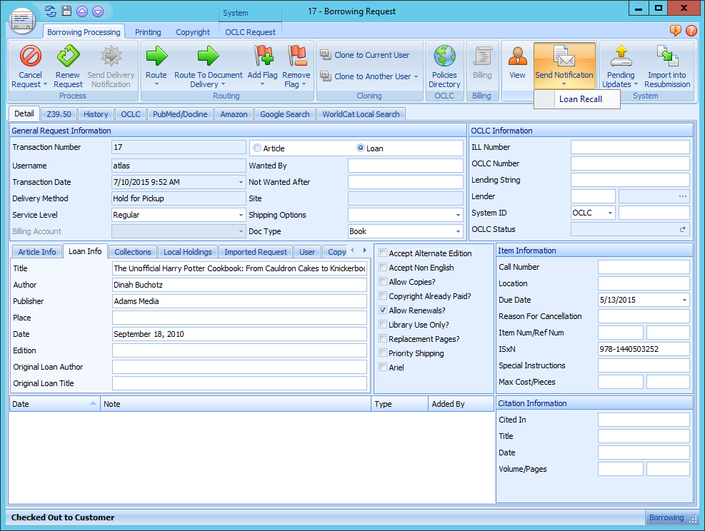 The Recall process can be partially automated by setting up an Email Routing option in your ILLiad database. This automated recall process is now a part of the basic ILLiad setup. For older ILLiad systems, this Email routing option may not exist in your system. If you set up the Recall Email Routing option locally rather than as part of your initial ILLiad installation, your system may look and behave slightly differently than the process described here.