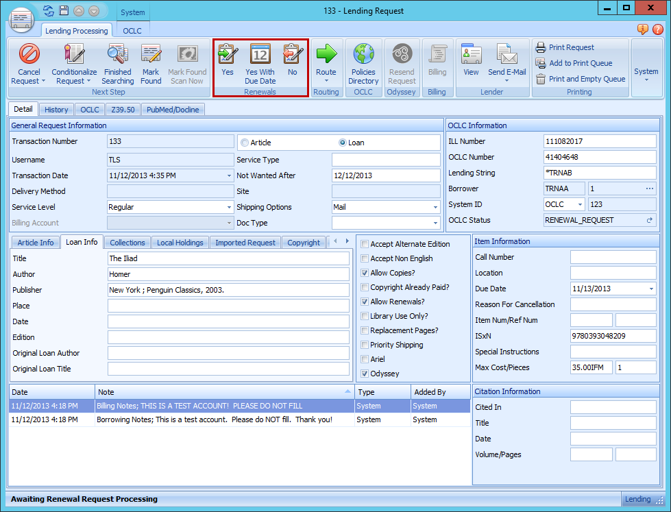 3. If you choose not to renew the item, click No in the Renewals group of the Lending Processing Ribbon. The transaction status will return to Item Shipped.