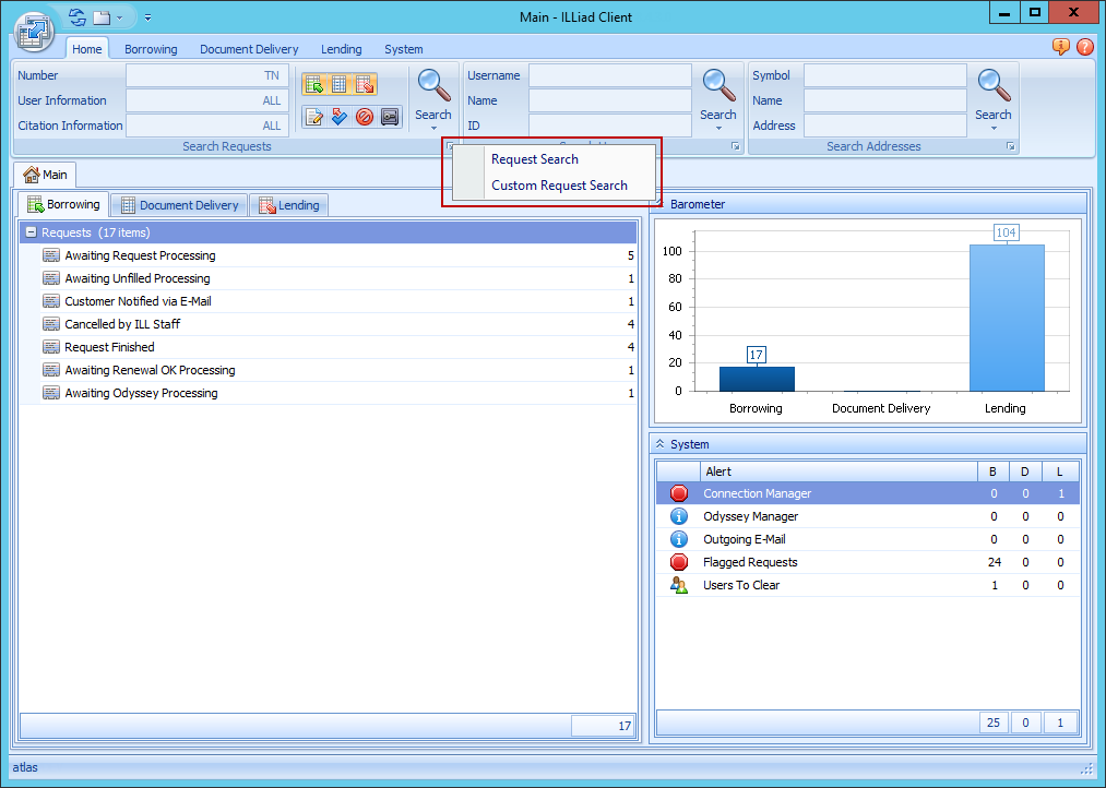 - To open custom searching, click on the small arrow under the Search button and select Custom Request Search.