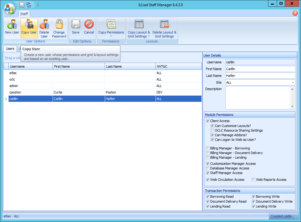 All ILLiad staff permissions and layout settings are saved in the ILLiad database in the Staff and StaffLayouts tables.