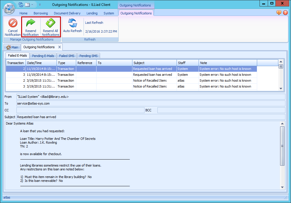 The log of outgoing, pending, and failed emails and SMS messages are viewed from the System group. A note with the reason for failure is displayed. All failed notifications can be corrected and resent or simply cancelled. You can work with one notification at a time or select several in the grid.