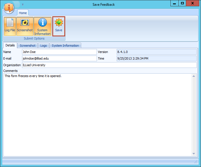 The ILLiad Feedback system provides staff with a convenient way to collect client information to send to ILLiad support. The Feedback icon, located on the right side of the ILLiad client, allows you to open the Feedback form from any page in the ILLiad client. ILLiad collects data about the issue from several tabs on the form. When you save the form, the data is transferred to a .zip file that you can easily email to support.