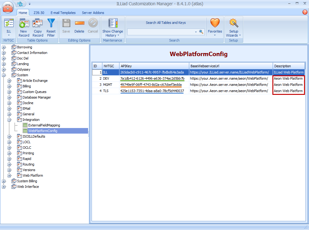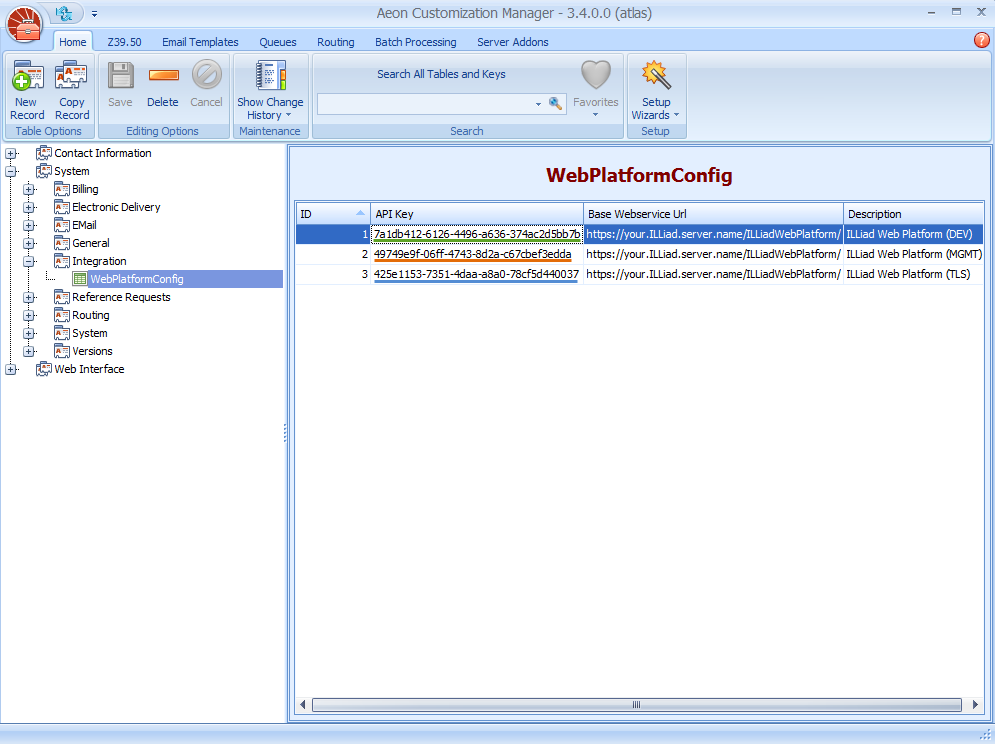 First, we will make entries in the WebPlatformConfig table. This table provides ID information that allows ILLiad and Aeon to talk to each other.